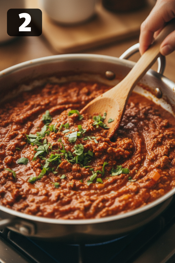 2. Make The Meat Sauce In a large skillet or pot, cook the meat over medium-high heat, breaking it into small crumbles. When most of the pink is gone, add the diced onion. Cook until soft and lightly golden. Stir in the garlic and any extra veggies (like mushrooms or peppers). Cook until fragrant. Drain off excess fat if there’s a lot in the pan. Pour in the marinara sauce, add Italian seasoning, salt, pepper, and any optional spice. Let it simmer 10–15 minutes while you work on the cheese layer. You’re looking for a sauce that’s slightly thick and rich, not watery. If it feels thin, let it bubble a bit longer.