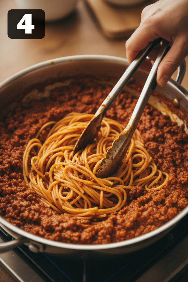4. Combine Pasta With A Bit More Sauce Take the spaghetti you tossed with butter earlier. Add some more sauce—just enough to lightly coat all the noodles without turning them into soup. Taste a strand and adjust salt if needed. This small step makes sure every bite of pasta is flavorful, not just the bites that touch the top sauce.