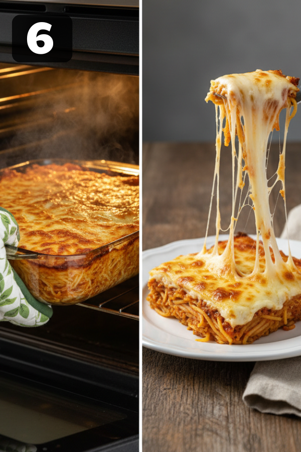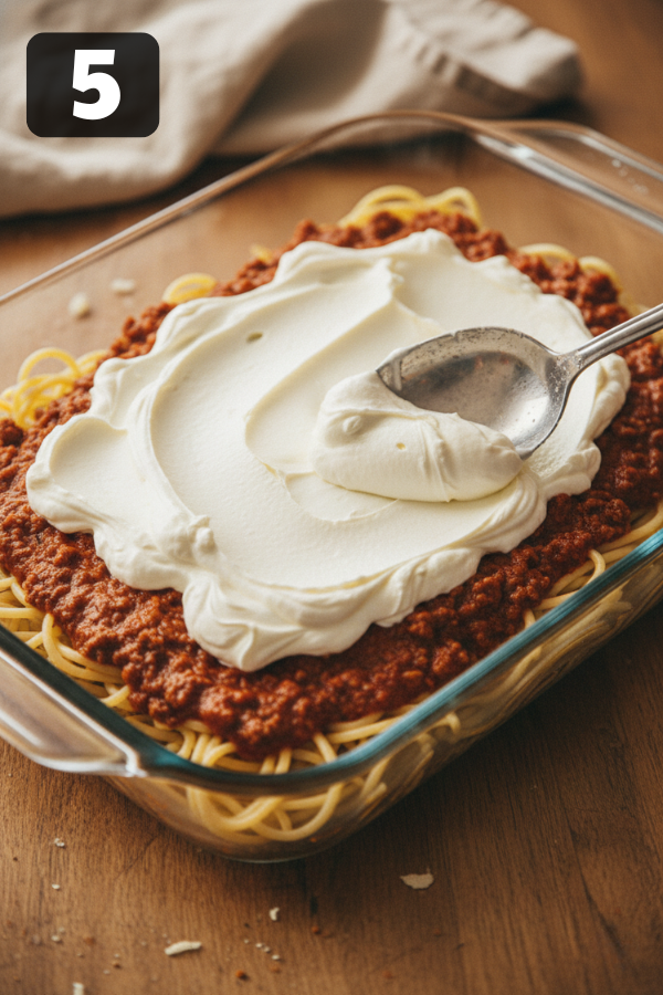 5. Layer Like A Lazy Lasagna Preheat your oven to 350°F (175°C) and grease a 9×13 baking dish. Then build your casserole: Bottom layer: spread half of the sauced spaghetti in the dish. Creamy layer: dollop the entire cream cheese mixture over the pasta and spread it gently. It doesn’t have to be perfect—little pockets of cream are nice. Second pasta layer: add the rest of the spaghetti and spread it out. Meat sauce: pour the meat sauce evenly over the top. Cheese topping: sprinkle mozzarella and Parmesan over everything. You’ll see layers of noodles, cream, sauce, and cheese. It should look hearty and a bit extra—that’s the point.