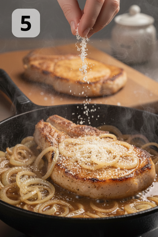 - Step 5: Smother The Chops And Finish Cooking Nestle the pork chops back into the gravy. Spoon onions over the top. Now pick your finishing path: Stovetop finish (best for thin chops): Cover the pan and simmer gently until chops are cooked through, usually just a few minutes for thin chops. Oven finish (best for thick chops and the gooey cheese look): If your skillet is oven-safe, top chops with cheese and bake at 400°F for about 8–10 minutes, until the cheese melts and the pork is cooked through. If your skillet isn’t oven-safe, transfer everything to a baking dish and do the same.