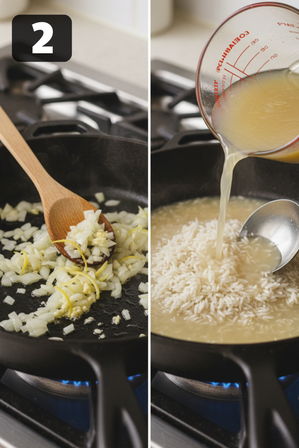 - 2) Build the Flavor Base Sauté the onions and garlic In the same pan (don’t wipe it), add chopped onion. Cook 2–3 minutes until softened and slightly translucent. Add minced garlic and cook about 1 minute until fragrant. Keep stirring so garlic doesn’t brown too fast (burnt garlic tastes bitter). Add the rice Stir in the rice and cook about 1 minute. Goal: lightly toast the rice so it picks up the pan flavors. This step helps prevent the rice from tasting “flat” later. Add liquid and seasoning Pour in: Chicken broth Lemon zest Lemon juice Remaining oregano Stir well and scrape up browned bits from the bottom (those bits = built-in seasoning). Bring to a gentle simmer. You want small bubbles, not a rolling boil—boiling can over-reduce liquid before the oven step.
