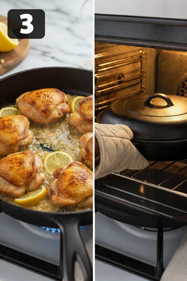 - 1) Prepare the Chicken and Season Season the chicken Pat chicken thighs dry with paper towels first (dry skin = better browning). Season both sides with: Salt Black pepper Half the dried oregano Optional but helpful: add a little lemon zest into the seasoning for brighter flavor. Marinate time Minimum: 20 minutes (enough to start flavoring) Better: 45–60 minutes if you’re around Best: overnight in the fridge (if you plan ahead) If marinating longer than 20 minutes, keep it covered in the fridge; bring closer to room temp for ~10 minutes before cooking so it sears evenly. Heat the pan Use a large oven-safe skillet (cast iron or heavy stainless works best). Add olive oil and heat on medium-high until it shimmers (hot but not smoking). If the oil smokes hard, lower heat slightly—too hot can burn the seasoning before the chicken browns. Sear the chicken Place thighs skin-side down first. Cook 5–7 minutes without moving them much. You’re looking for deep golden brown skin, not pale “half-browned.” Flip and cook another 5–7 minutes on the other side. Remove chicken to a plate. Leave some drippings in the pan (that’s flavor), but if there’s a lot of grease, spoon off excess so the rice doesn’t turn oily.