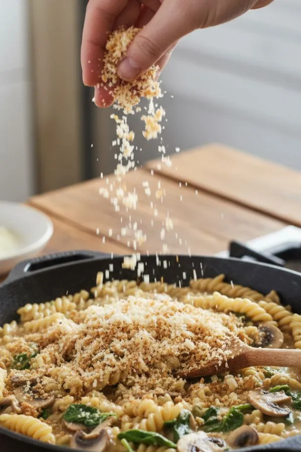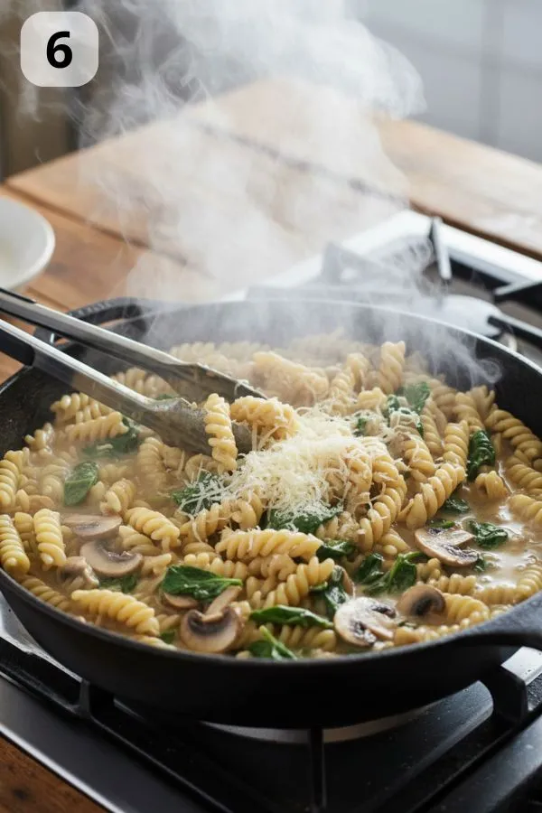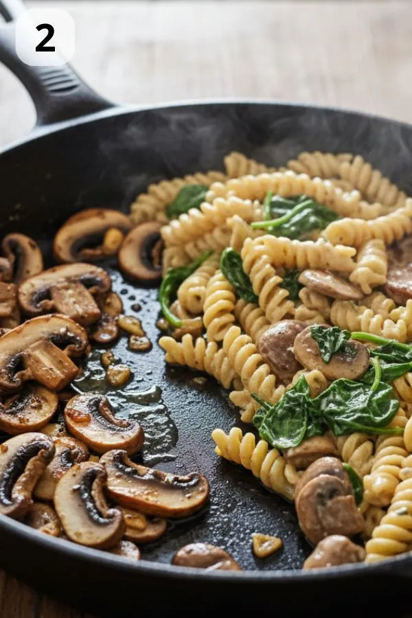 - Step 2: Add the Mushrooms (5–7 minutes): When the pasta starts to soften (after ~6–7 minutes), push it gently to one side of the skillet. Add a drizzle of olive oil to the empty space, then place sliced mushrooms in a single layer. Let them brown undisturbed for 2–3 minutes per side until golden. Season with salt and pepper.