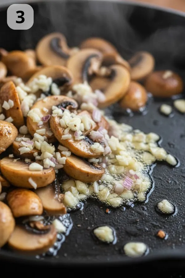 - Step 3: Add the Garlic (1–2 minutes): Push mushrooms aside slightly and add minced garlic to the skillet. Sauté for 30–45 seconds until fragrant but not browned. The aroma at this stage is incredible — earthy mushrooms meeting sweet, warm garlic.
