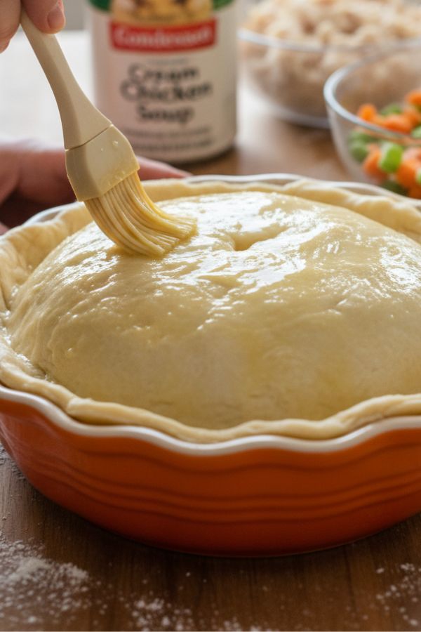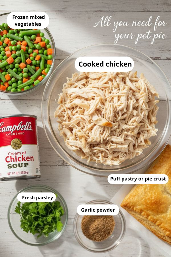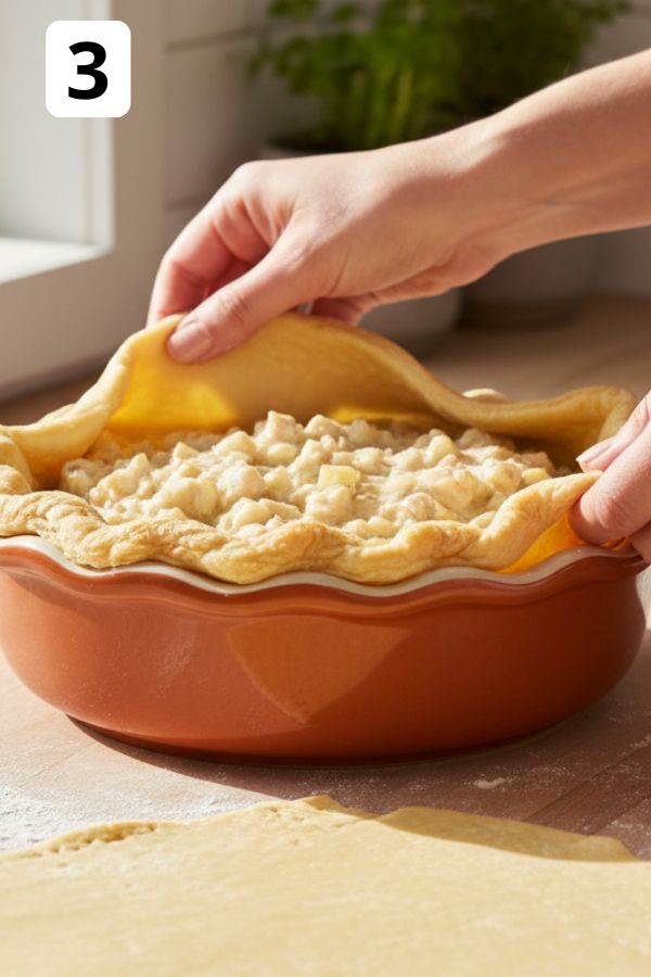 - Step 3: Prepare the Crust: Roll out your puff pastry or pie crust to fit your baking dish (about 8x8 inches or a 9-inch pie dish). Place the dough over the chicken mixture and press the edges to seal.