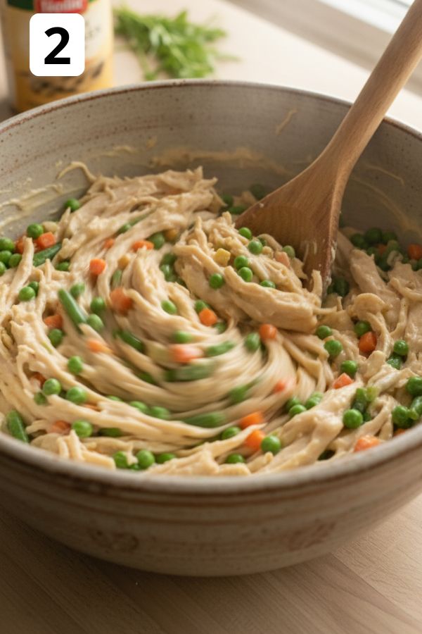 - Step 2: Prepare the Filling: In a large mixing bowl, combine the cooked chicken, cream of chicken soup, and frozen mixed vegetables. Stir everything together until well mixed. Season with salt and pepper to taste. This is your creamy, savory filling.