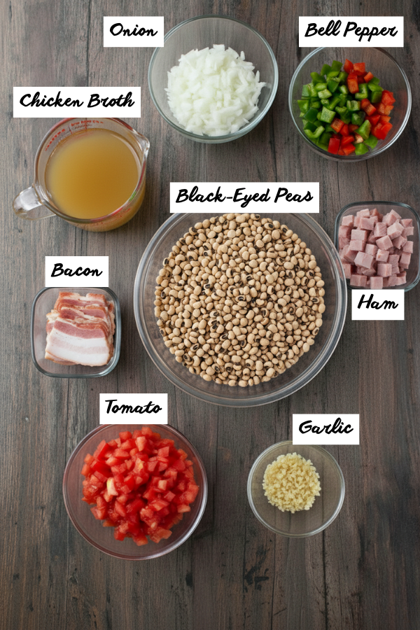 One pound of dried black-eyed peas plus some broth and leftover ham easily feeds 6–8 people. If you’ve got a ham bone from Christmas or Easter, this is the perfect way to use it instead of letting it sit in the freezer for six months.