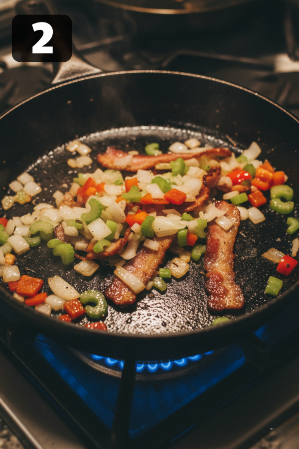 2. Cook bacon in a skillet, then sauté onion, celery, bell pepper, jalapeño, and garlic with spices.