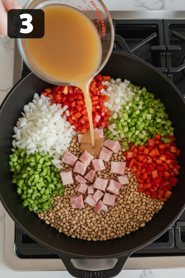 Important: Hold back on heavy salting at this stage—ham, bacon, and broth are already salty. You’ll adjust at the end when the peas are tender.