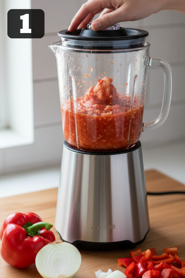 - Mix: Stir in blended onion/pepper, tomato paste, and herbs. Cook for 2 mins.