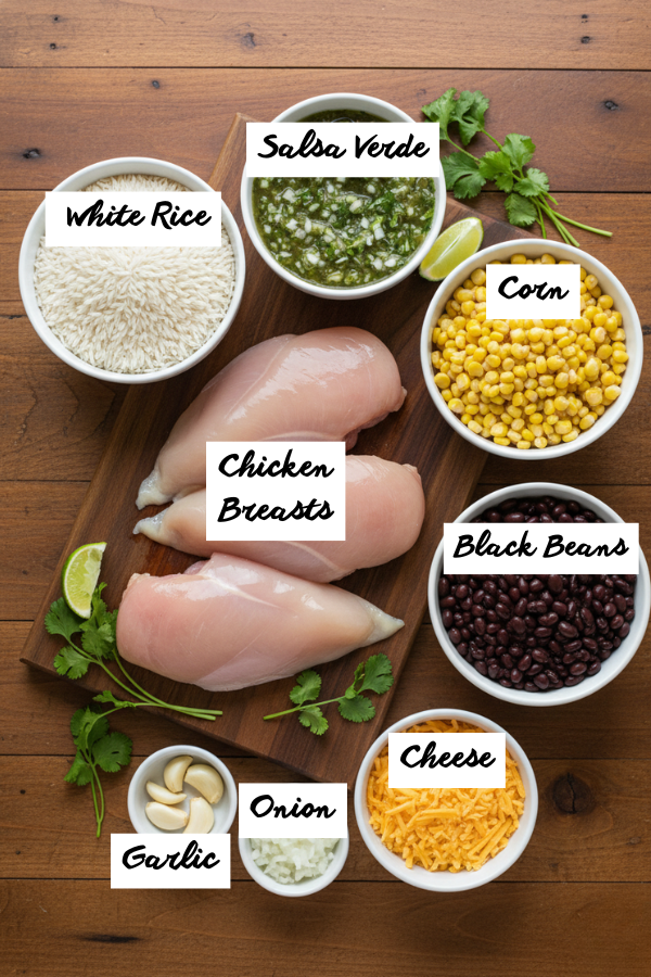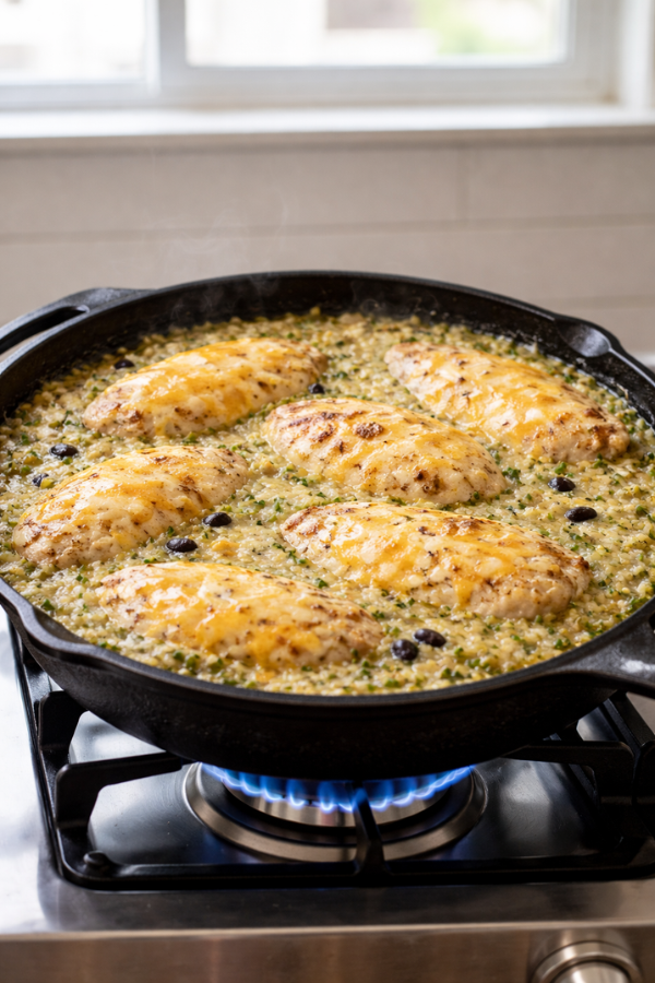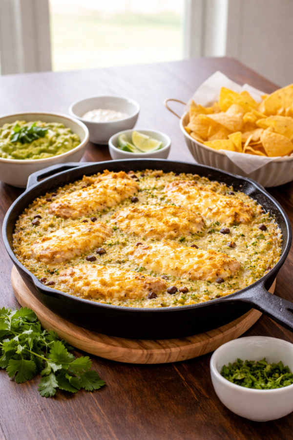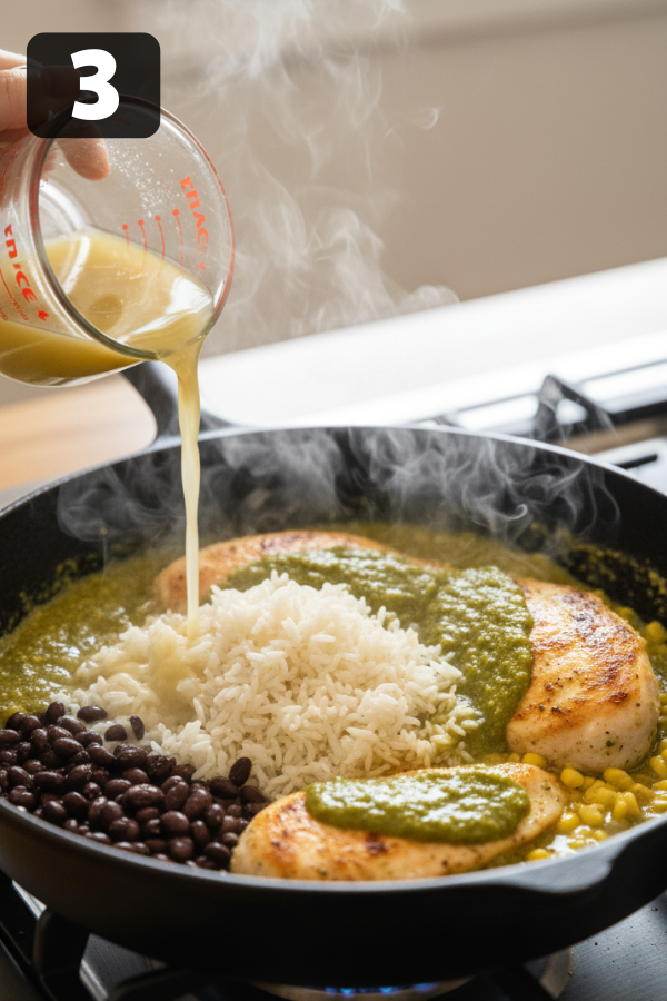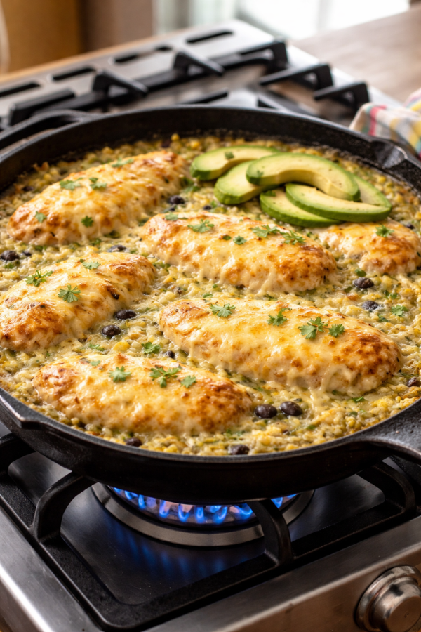 Everything cooks together in one pan—the chicken browns, the rice absorbs flavor, and the salsa verde quietly does its magic. By the time dinner is ready, the kitchen still looks… well, mostly normal.
