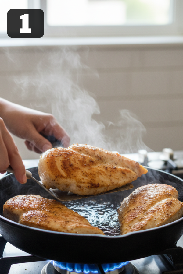 Season the chicken with salt, pepper, garlic powder, and cumin. Place the chicken in the skillet and cook for about 3–4 minutes per side until lightly golden.