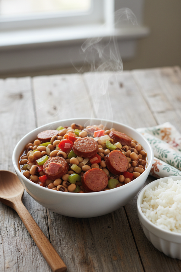 Black-eyed peas are affordable. Smoked sausage stretches far. Rice fills everyone up. When cooked low and slow, the flavors melt together into something rich and satisfying — without constant stirring or babysitting. For busy home cooks, that matters.
