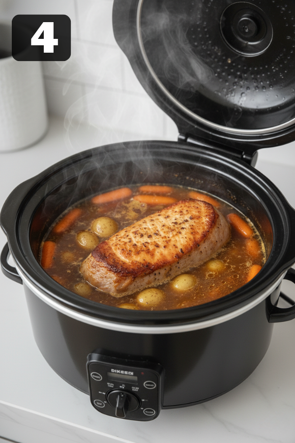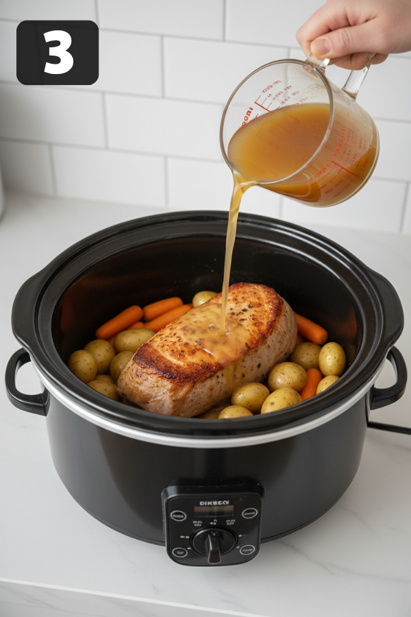Pour the broth and sauces into the slow cooker. Place the pork on top. If you’re adding vegetables, layer them underneath so they cook evenly.