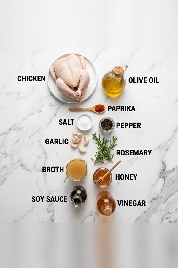 Then, pour the chicken broth, honey, soy sauce, and apple cider vinegar around the bird, allowing a gentle bubbling to form.