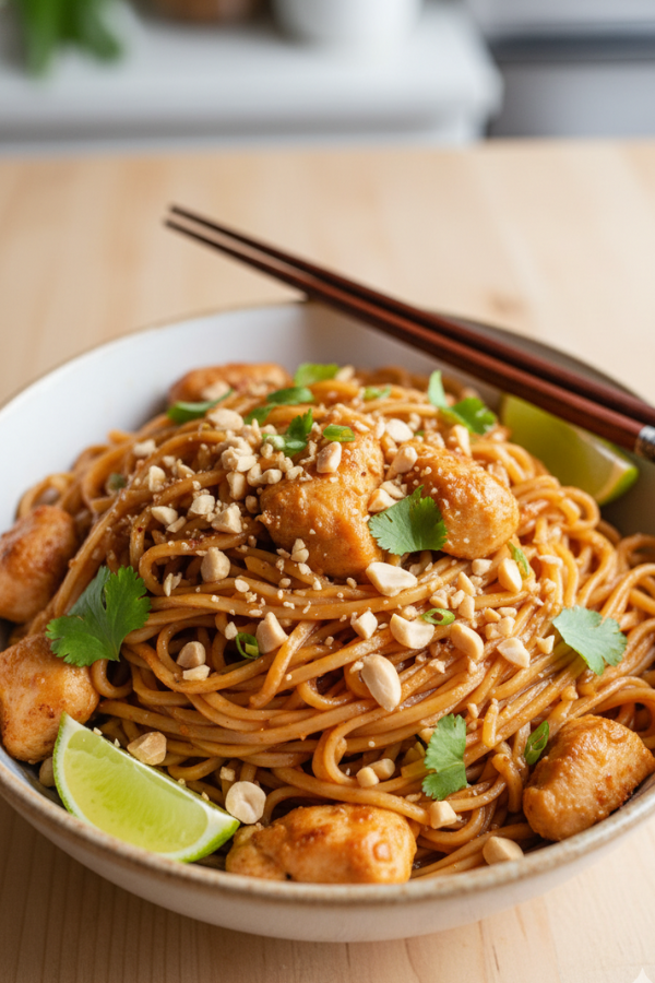 Most versions take 25–35 minutes, which is about the time it takes your kids to finish their homework or you to catch your breath after work. The sauce coats every strand of noodle — creamy peanut butter, salty soy, a little sweetness, and just enough heat to wake things up.