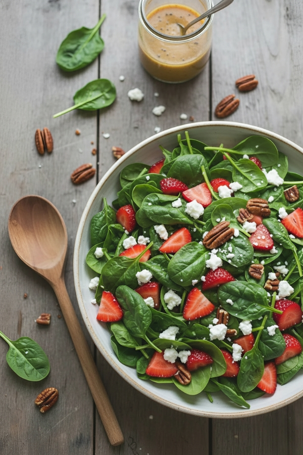 - Step 4: Assemble (2 minutes) Big salad bowl → spinach first. Add strawberries, onion, most of the nuts, and most of the feta. Drizzle with about ⅓ to ½ of the dressing. Toss gently with tongs so you don’t bruise the berries. Finish with the rest of the nuts and feta on top so it looks restaurant-level.