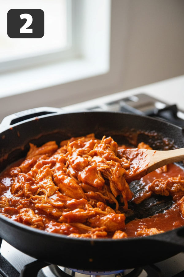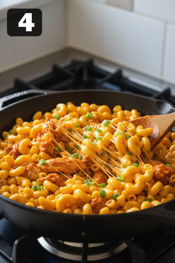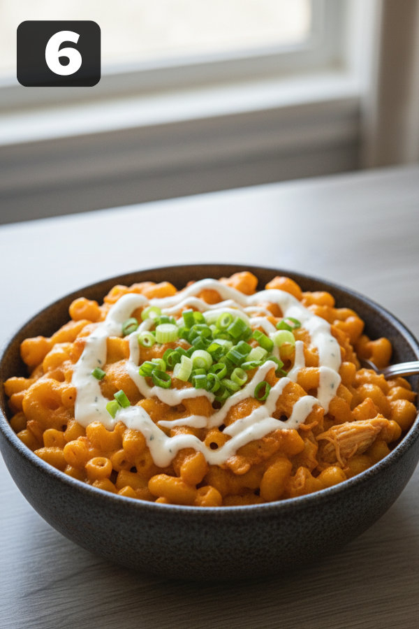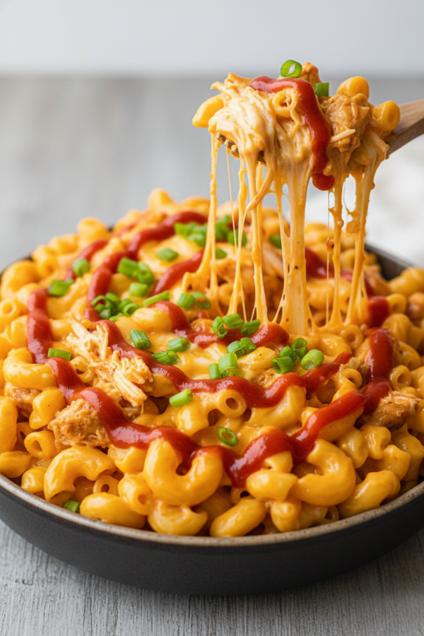 Step 1: Cook the PastaBring salted water to a boil and cook your pasta until just al dente.Don’t overcook it—it’ll soften more later in the sauce. Step 2: Warm the Buffalo ChickenIn a pan, toss your shredded chicken with buffalo sauce and heat gently.Let it sit for a minute or two. That helps the flavor soak in instead of just coating the outside. Step 3: Build the Cheese SauceMelt butter in a large pan, then whisk in flour. Cook for about a minute.Slowly pour in milk, whisking constantly. It thickens quickly—stay with it.Add cheese gradually (this part matters). Low heat, slow melting.If you rush it, the sauce can turn grainy. Nobody wants that. Step 4: Bring It All TogetherAdd pasta and buffalo chicken into the sauce.Stir gently. You want everything coated, not mashed.At this point, it’s already good enough to eat. Like, really good. Step 5 (Optional): Bake for That Golden TopTransfer to a baking dish, sprinkle extra cheese (or breadcrumbs), and bake at 375°F for 10–15 minutes.You’ll get that bubbly, slightly crispy top—like something from a restaurant. Step 6: Finish & ServeTop with green onions or a drizzle of ranch.Take a bite. Then another. Yeah… it’s that kind of meal.