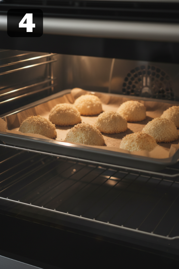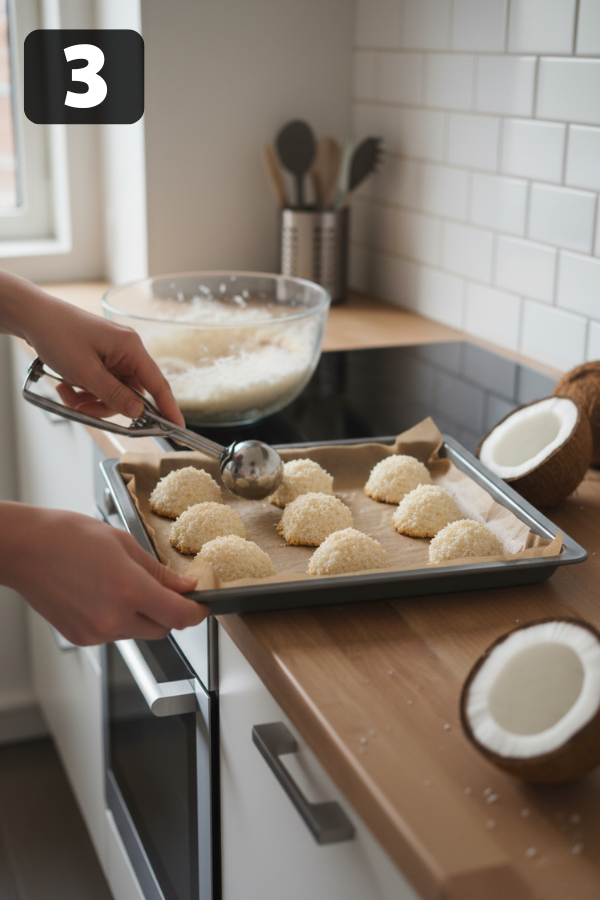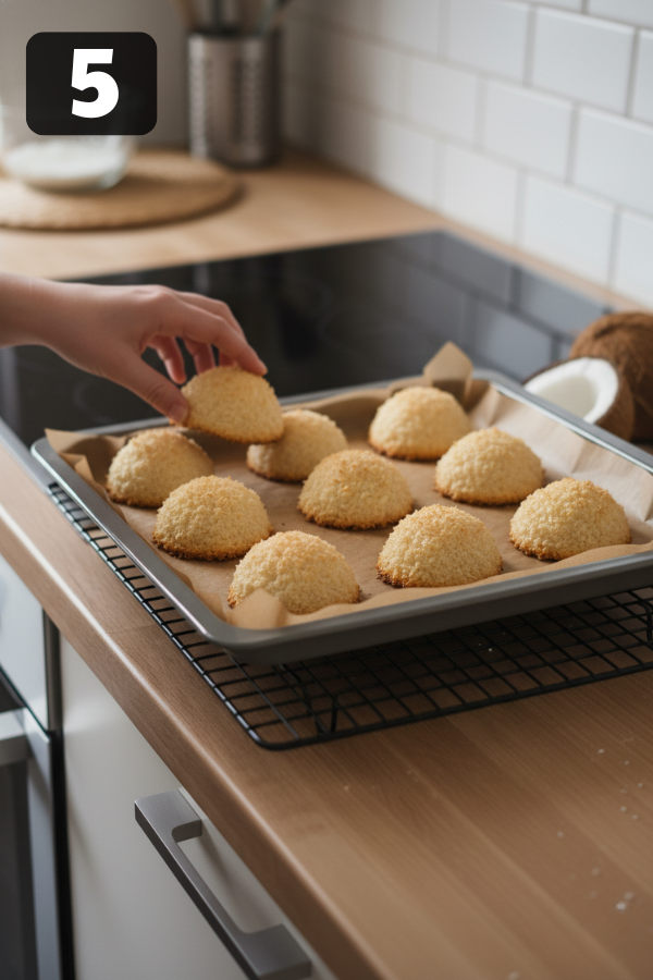 Step 1 – Preheat the OvenFirst, set your oven to 325°F (163°C). Then, line a baking sheet with parchment paper.This step is important because it prevents sticking and helps the cookies bake evenly. Step 2 – Mix the IngredientsNext, combine the coconut, sugar, egg whites, and vanilla in a bowl. After that, stir until the mixture becomes sticky and evenly coated.At this stage, the mixture should hold together when pressed. Step 3 – Shape the CookiesOnce mixed, scoop about 1–2 tablespoons for each cookie. Then, form small mounds using your hands or a spoon.To improve structure, lightly press each mound. Step 4 – BakePlace the tray in the oven and bake for 20–25 minutes. Meanwhile, keep an eye on the color.You’re looking for:Golden edgesLightly toasted topsFor best results, rotate the tray halfway through baking. Step 5 – CoolAfter baking, let the cookies rest on the tray for about 5 minutes. Then, transfer them to a cooling rack.As they cool, they will firm up and develop their final texture.
