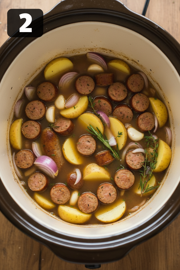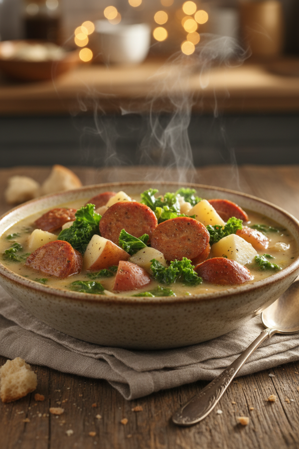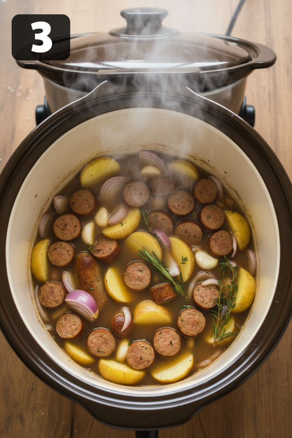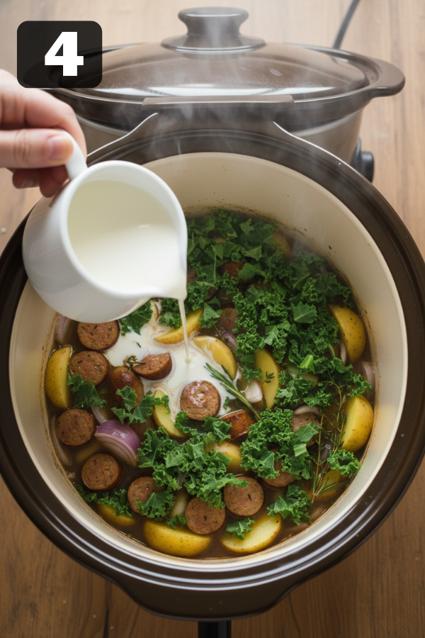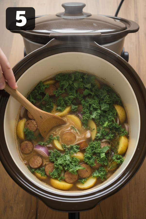 Step 1: Brown the Sausage (Build the Flavor)First, heat a pan and cook the sausage until browned and crumbly. This step matters more than it seems. Browning creates a deeper, richer flavor that simply doesn’t develop in the slow cooker alone. Step 2: Load the CrockpotNext, transfer the sausage into the crockpot. Then add:Sliced potatoesOnion and garlicChicken brothAfter that, give everything a quick stir so the ingredients are evenly distributed. Step 3: Let It Slow CookNow it’s time to let the crockpot do the work.Cook on LOW for 6–7 hoursOr use HIGH for 3–4 hoursDuring this time, the potatoes will soften and absorb all the surrounding flavor. Meanwhile, the broth becomes richer and more cohesive. Step 4: Add Kale and CreamAbout 20–30 minutes before serving, stir in the kale and pour in the cream. At this stage, keeping the heat lower helps prevent the cream from separating. At the same time, adding kale later ensures it stays vibrant instead of overcooked. Step 5: Taste and AdjustFinally, taste the soup and adjust seasoning as needed. You can add salt, pepper, or even a pinch of red pepper flakes for a bit of warmth. If the soup feels too thick, simply stir in a splash of broth.