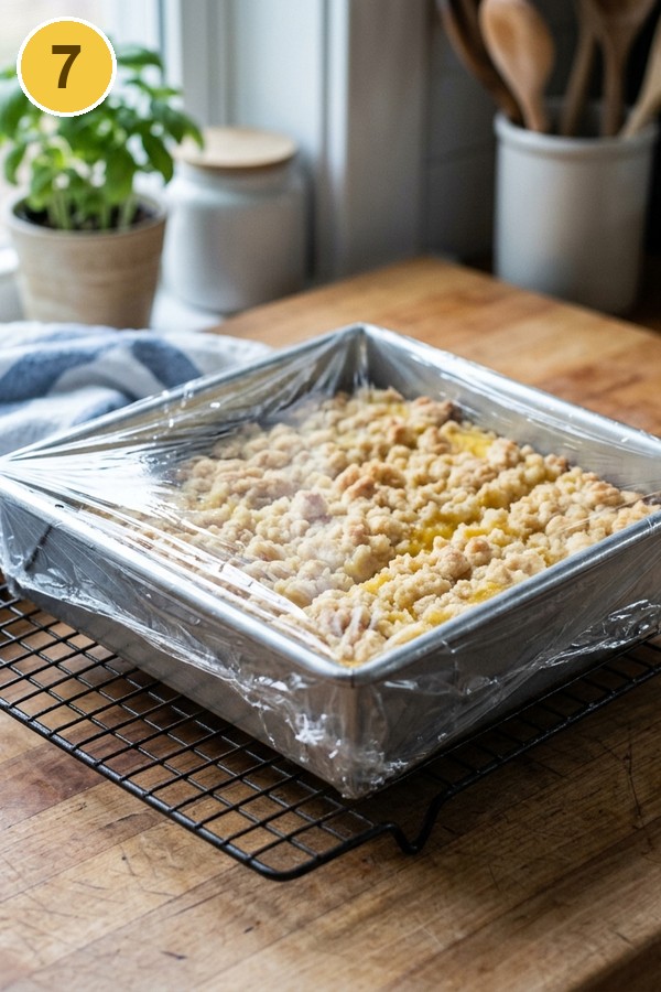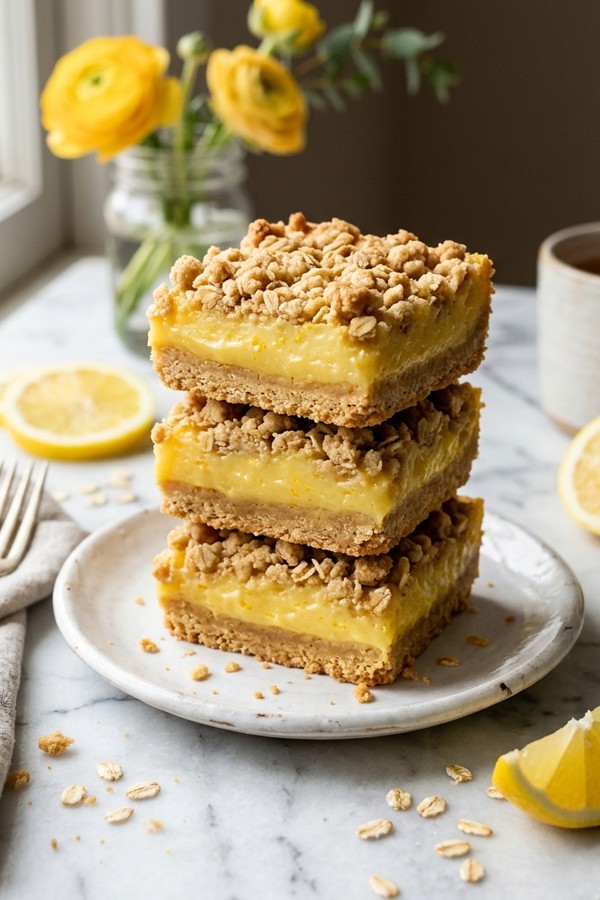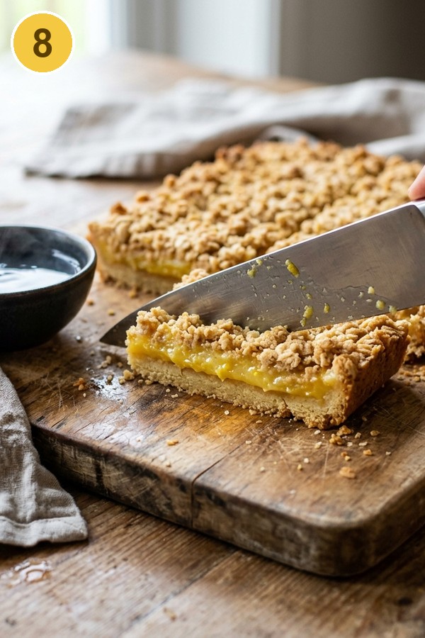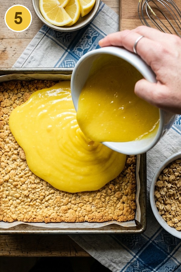 Pour lemon filling evenly over the warm crust. Sprinkle reserved crumb topping evenly over the filling.