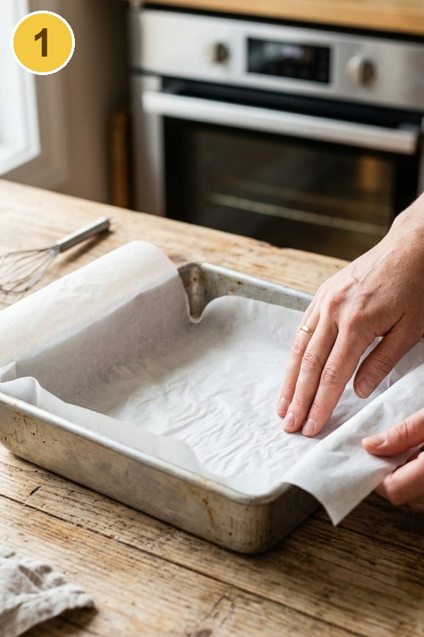 Preheat oven to 350F (175C). Line an 8x8-inch baking pan with parchment paper, leaving 1-inch overhang on all four sides.