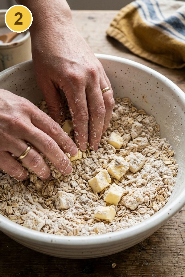 In a large bowl, combine flour, oats, brown sugar, baking powder, and salt. Add cold butter cubes and work in with fingertips until the mixture resembles coarse crumbs with pea-sized butter pieces. Do not overmix.