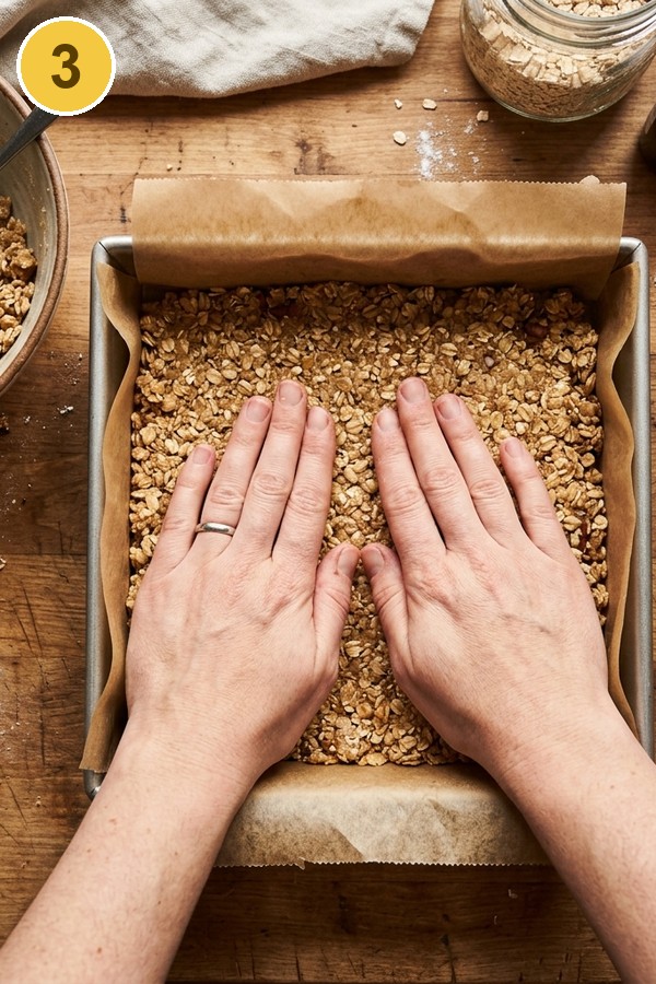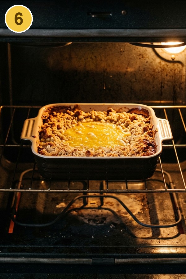 Press two-thirds of the crumb mixture firmly into the pan. Reserve remaining third for topping. Bake for 12 to 14 minutes until edges turn golden. Remove from oven but do not turn it off.