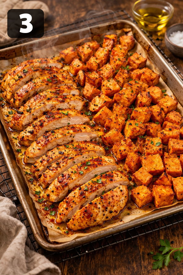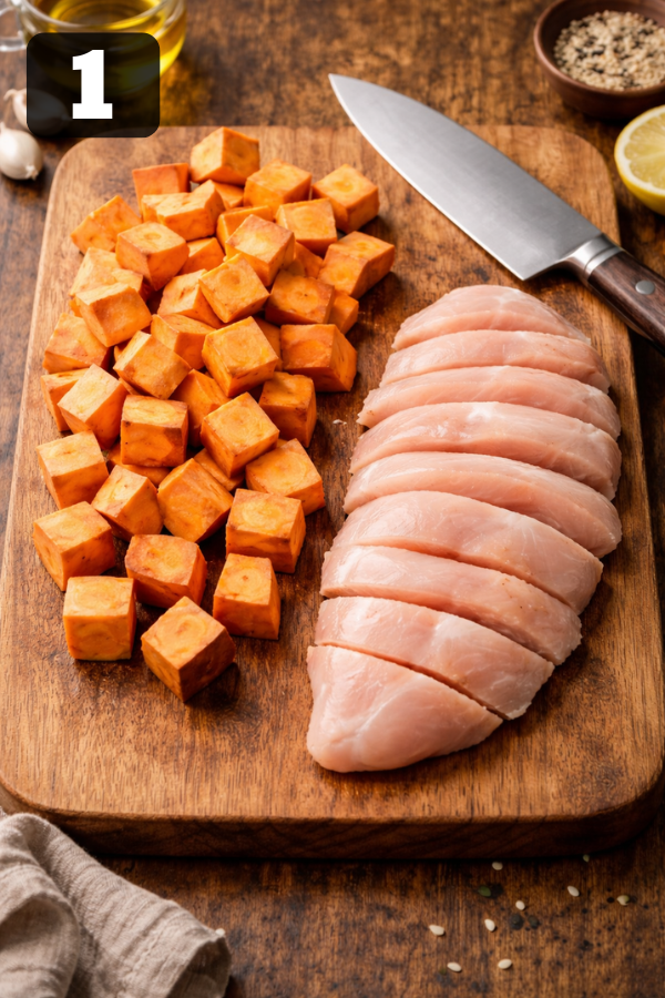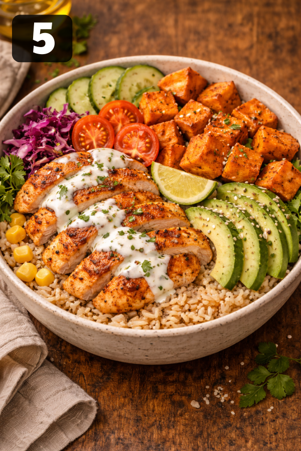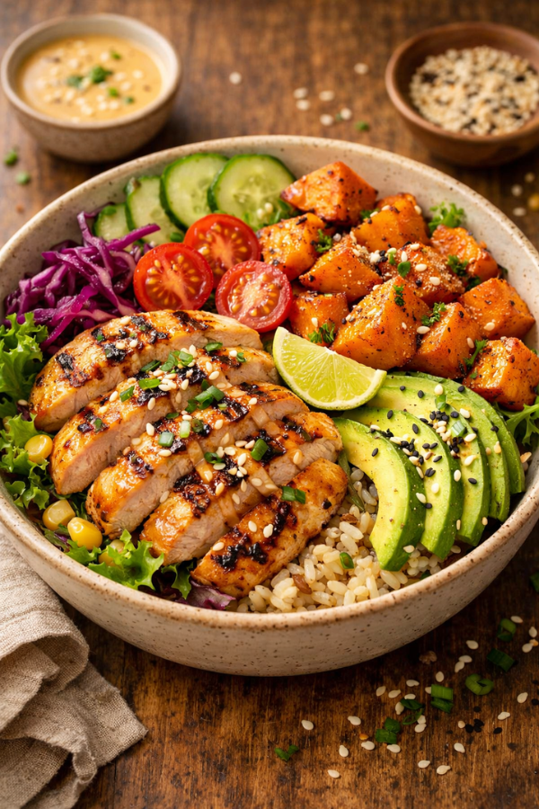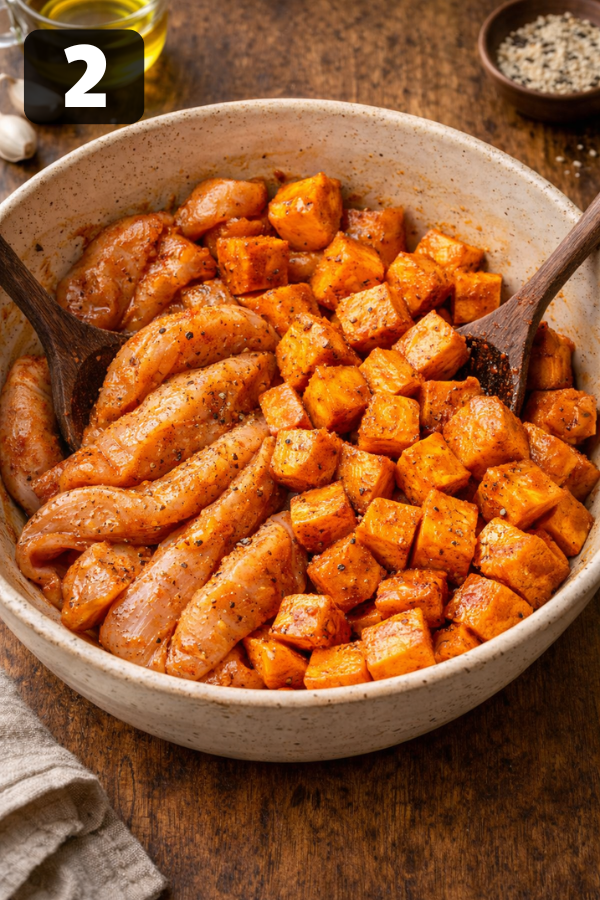 Step 1: Prep Your IngredientsPreheat your oven to 400°F (204°C).Cut:Sweet potatoes into even cubesChicken into bite-sized chunks (optional)Why it matters: Even pieces = even cooking. No surprises. Step 2: Season EverythingIn a large bowl:Toss sweet potatoes with olive oil + spicesDo the same with chicken (separately or together—your call)Tip: Don’t be shy with seasoning. Roasting dulls flavors slightly. Step 3: Roast It AllSpread everything onto a sheet pan.Roast for 25–30 minutesFlip halfway throughChicken should reach 165°F internally Sweet potatoes should be golden with crispy edgesImportant: Give everything space. Crowding = steaming = sadness. Step 4: Make A Quick Sauce (Optional But Worth It)You can skip this. But you probably shouldn’t.Quick garlic yogurt sauce:Greek yogurtLemon juiceGarlicPinch of saltOr go bold:Peanut sauce (sweet + savory)Buffalo sauce (spicy + tangy) Step 5: Build Your BowlLayer it like this:Base (rice or greens)ChickenSweet potatoesToppingsSauce drizzleAnd that’s it. Dinner’s done.