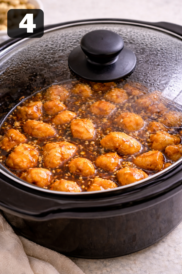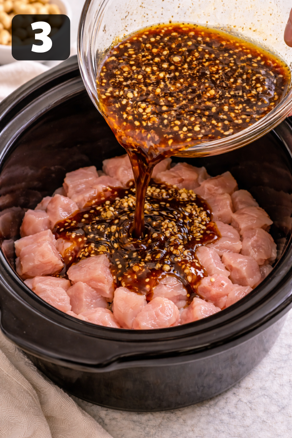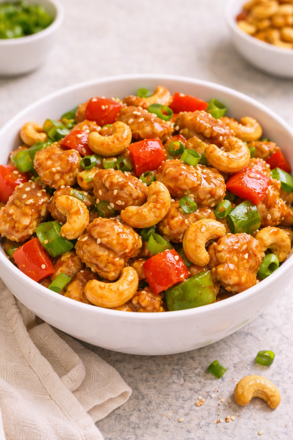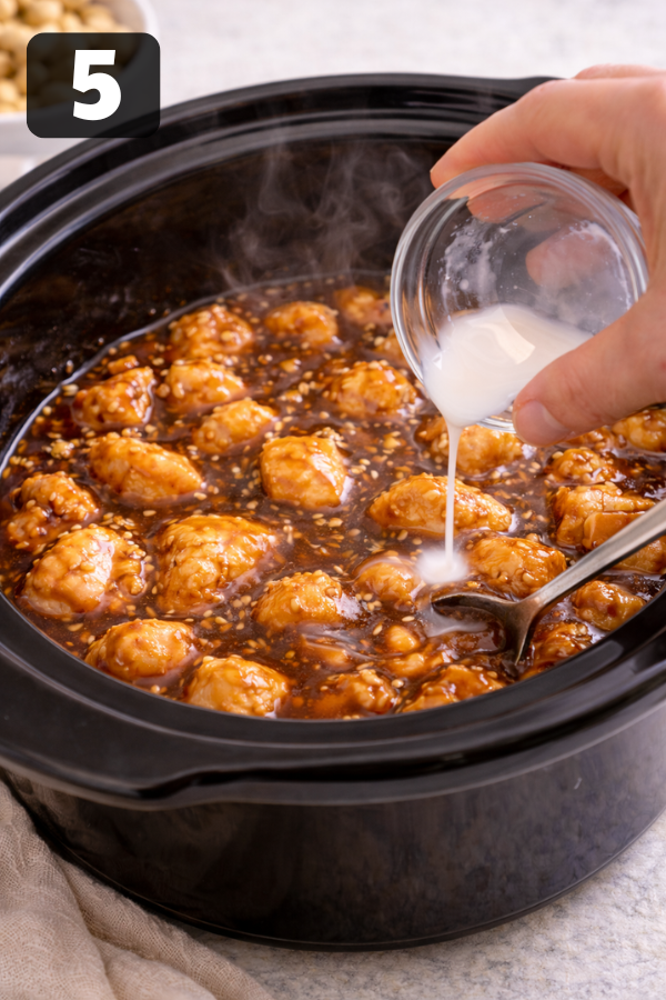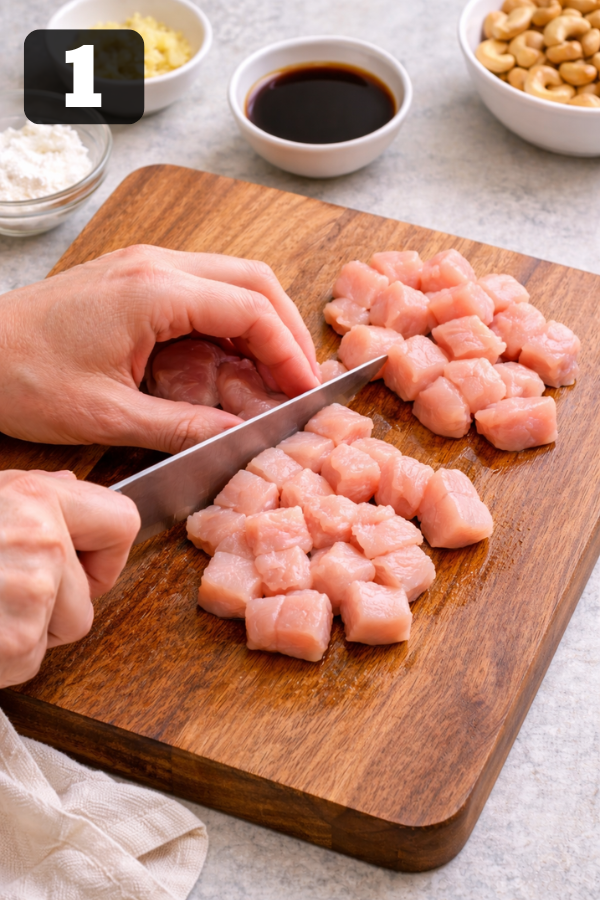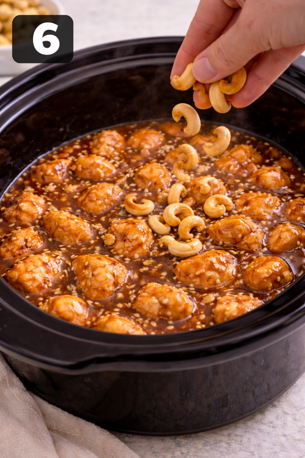 Step 1: Prep the ChickenCut the chicken into small pieces. Try to keep them the same size so they cook evenly. Step 2: Make the SauceMix soy sauce, sugar, garlic, ginger, and vinegar in a bowl. Stir until combined. Step 3: Add to Slow CookerPlace the chicken inside. Pour the sauce over it.Make sure most pieces are covered. Step 4: CookLOW: 3–4 hoursHIGH: 2–3 hoursNow you can walk away. That’s the beauty of it. Step 5: Thicken the SauceAbout 30 minutes before serving:Mix cornstarch with waterAdd it to the slow cookerStir gently. The sauce will start to thicken. Step 6: Add CashewsAdd cashews right before serving.If you add them too early, they will turn soft. And honestly, the crunch is what makes this dish special.