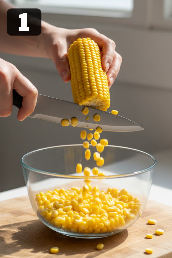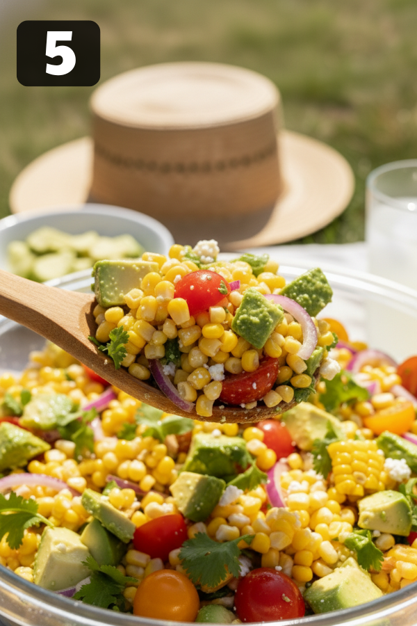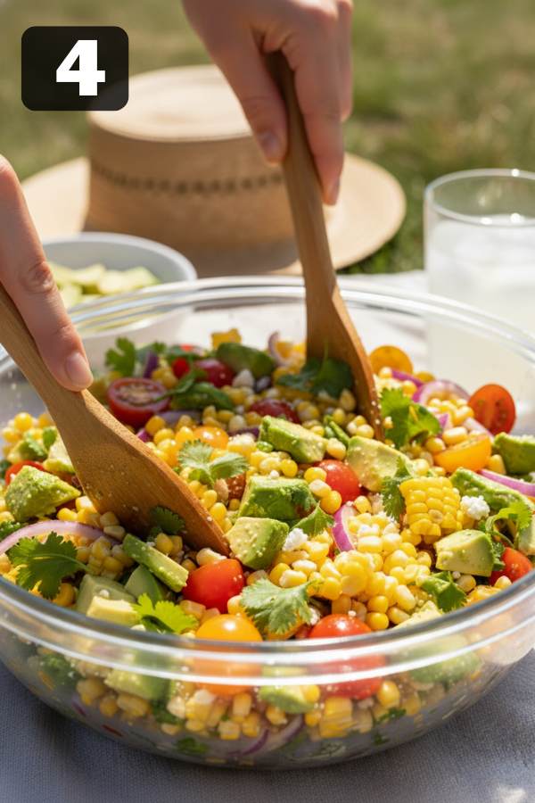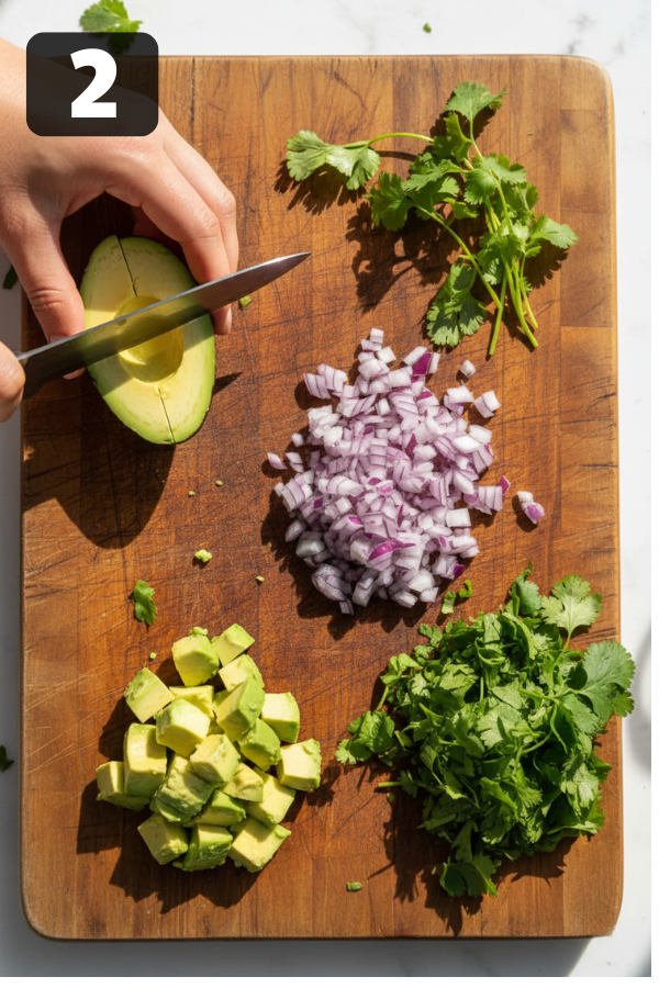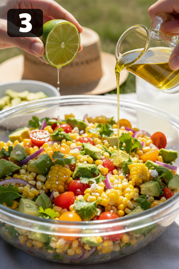 Step 1 – Prep the CornCut kernels off the cob.Tip: Stand the cob in a bowl while cuttingLess mess, fewer runaway kernelsIf using frozen corn:Thaw itPat it dry (this matters more than you think) Step 2 – Chop Everything ElseDice avocado into medium chunksFinely chop onionRoughly chop cilantroKeep it rustic—no need to be perfect here. Step 3 – Build the BaseIn a large bowl:Add corn, onion, cilantroPour in lime juice + olive oilToss gently. Step 4 – Add the Avocado (Last, Always Last)This part matters.Fold it in gentlyDon’t stir aggressivelyOtherwise… you’ll end up with something closer to guacamole. Still good—but not what we’re going for. Step 5 – Taste and AdjustThis is where the magic happens.Needs more brightness? Add limeFlat? Add saltToo sharp? A drizzle of honey can soften itTrust your taste buds here.
